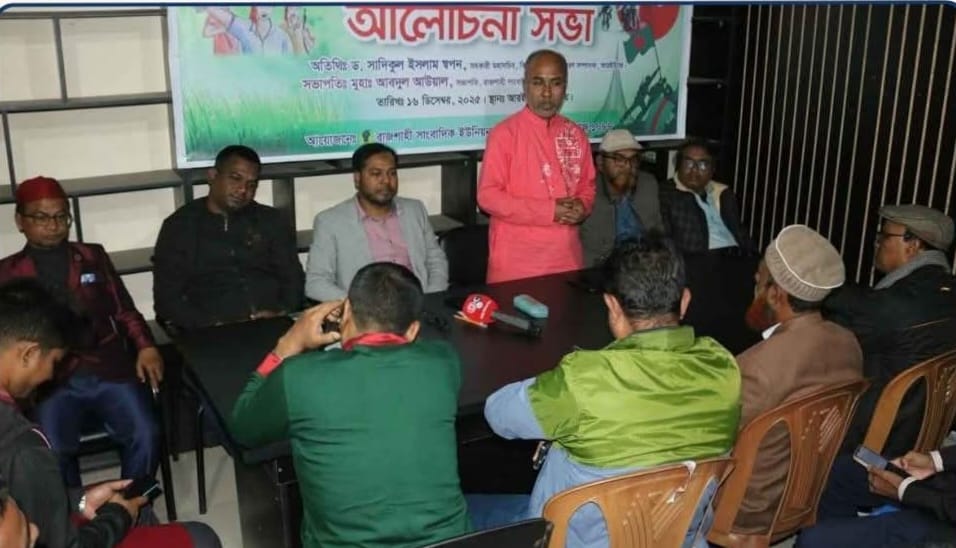 স্টাফ রিপোর্টার : রাজশাহীতে আয়োজিত এক আলোচনা সভায় সাংবাদিক নেতারা বলেছেন, ‘আধিপত্যবাদী শক্তির সহযোগিতায় ফ্যাসিস্ট আওয়ামী লীগ জুলাইযোদ্ধাদের টার্গেট করে হত্যার পরিকল্পনা করছে। এরই অংশ হিসেবে ওসমান হাদির ওপর গুলিবর্ষণ করা হয়েছে। ওসমান হাদিকে গুলি করার অর্থ হলো প্রতিটি জুলাইযোদ্ধার মাথায় গুলি করা। কিন্তু এদেশের বিপ্লবী ছাত্রজনতা পরাজিত শক্তির কাছে কখনো মাথা নোয়াবে না।’ তারা বলেন, ‘আধিপত্যবাদী শক্তির এবং তার দোসর ফ্যাসিস্ট আওয়ামী লীগের সব ষড়যন্ত্র নস্যাৎ করে নতুন বাংলাদেশ বিশ্বের বুকে মাথা উঁচু করে দাঁড়াবেই ইনশাআল্লাহ। আর নতুন বাংলাদেশ বিনির্মাণের মধ্য দিয়েই জাতি স্বাধীনতার প্রকৃত স্বাদ উপভোগ করবে।’