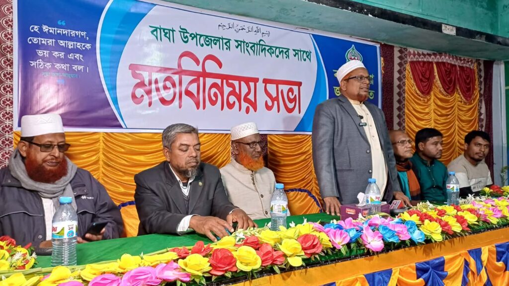 শনিবার (২৭ ডিসেম্বর) দুপুরে উপজেলা জাগ্রত বাঘা শাখা কার্যালয়ে এ মতবিনিময় সভা অনুষ্ঠিত হয়। উপজেলা জামায়াতের আমীর আব্দুল্লাহ আল মামুন নুহুর সভাপতিত্বে এবং বাঘা উপজেলা জামায়াতের নায়েবে আমীর অধ্যাপক সাইফুল ইসলামের সঞ্চালনায় সভা অনুষ্ঠিত হয়।