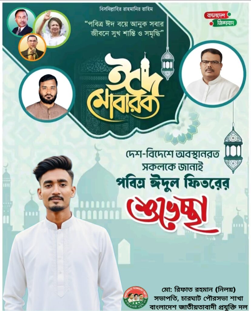 পবিত্র ঈদুল ফিতর উপলক্ষে দেশ-বিদেশে অবস্থানরত সকল শুভাকাঙ্ক্ষী ও চারঘাট পৌরবাসীকে আন্তরিক শুভেচ্ছা ও ঈদ মোবারক জানিয়েছেন বাংলাদেশ জাতীয়তাবাদী প্রযুক্তি দল, চারঘাট পৌরসভা শাখার সভাপতি মো: রিফাত রহমান (নিলয়)।