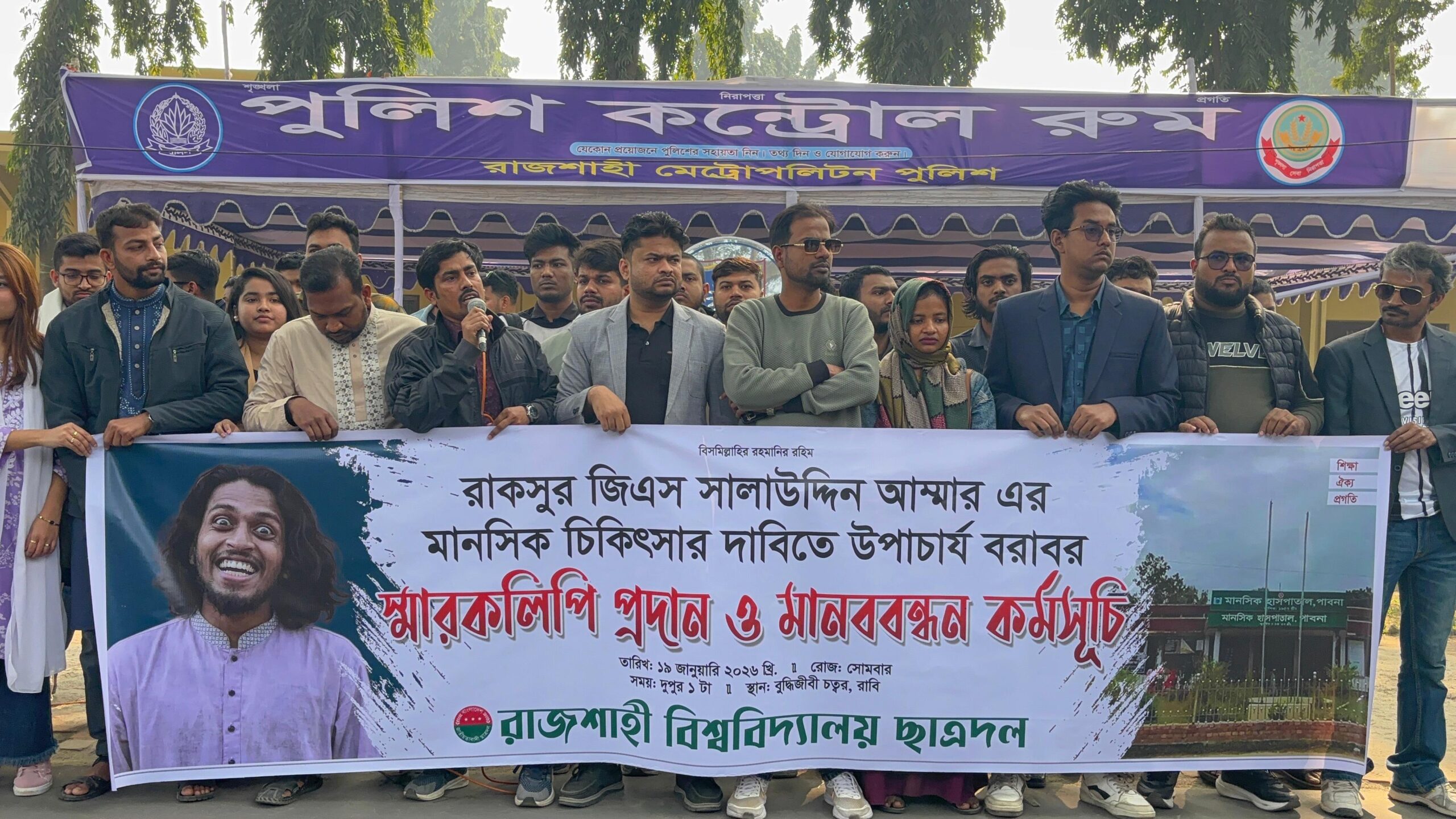 তারেক রহমানকে শুভেচ্ছা জানানো ব্যানার ছেঁড়ার ঘটনায় রাবি ছাত্রদলের মানববন্ধন, আম্মারের মানসিক চিকিৎসার দাবি