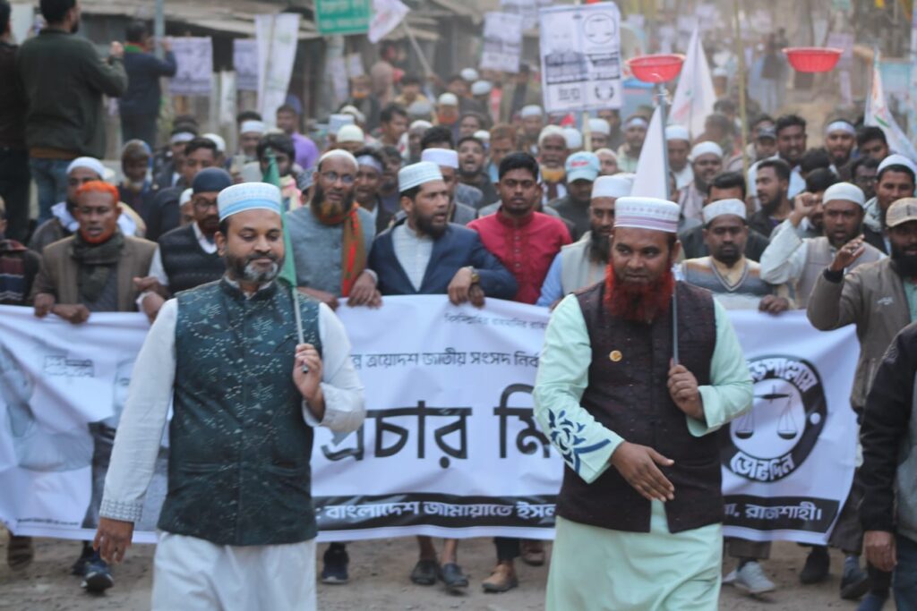স্টাফ রিপোর্টার: আসন্ন ত্রয়োদশ জাতীয় সংসদ নির্বাচনকে সামনে রেখে রাজশাহীর দুর্গাপুরে নির্বাচনী প্রচারণা জোরদার করেছে বাংলাদেশ জামায়াতে ইসলামী। শুক্রবার (৭ ফেব্রুয়ারি) বিকেলে উপজেলা বাজার এলাকায় দলটির উদ্যোগে দাঁড়িপাল্লা প্রতীকের পক্ষে গণসংযোগ ও মিছিল অনুষ্ঠিত হয়।