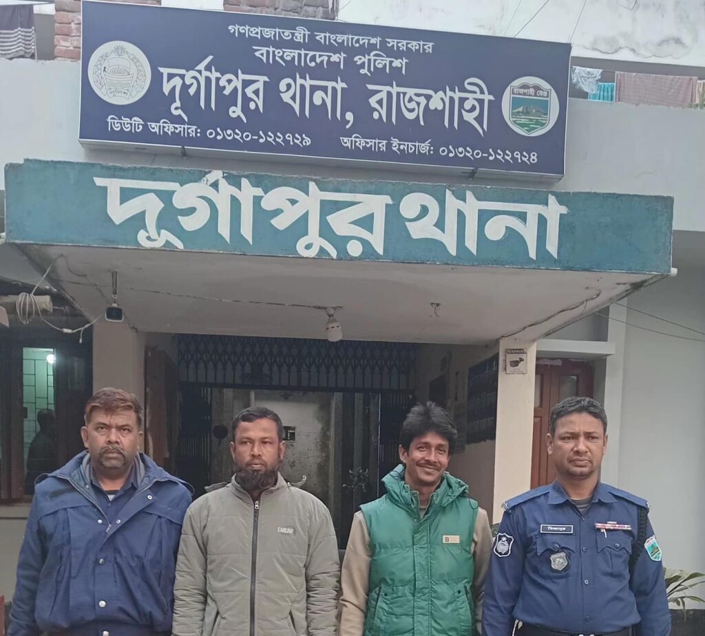 থানা সূত্রে জানা যায়, দুর্গাপুর ডিগ্রি কলেজের গেট সংলগ্ন মো. জিয়াউল হক রতনের আধা পাকা টিনের ঘরে অভিযান চালিয়ে মো. রেন্টু (৩৮) পিতা মো. সিদ্দিকুর রহমান এবং মো. আনোয়ারুল (৩৬) পিতা মো. শাহিদ আলী—উভয়কে আটক করা হয়। আটককৃতরা সিংগা পশ্চিম পাড়া গ্রামের বাসিন্দা।