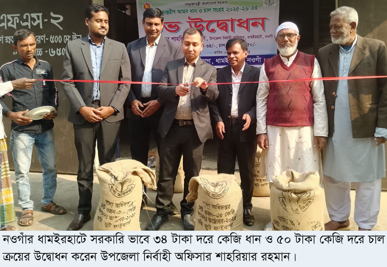 ধামইরহাট (নওগাঁ) প্রতিনিধি: নওগাঁর ধামইরহাটে চলতি অর্থ বছরে সরকারি ভাবে আমন ধান ও চাল সংগ্রহের উদ্বোধন করা হয়েছে। ৪ ডিসেম্বর (বৃহস্পতিবার) দুপুর ২টায় উপজেলা খাদ্য গুদামে ধান ও চাল ক্রয়ের উদ্বোধন করেন উপজেলা নির্বাহী অফিসার শাহরিয়ার রহমান।