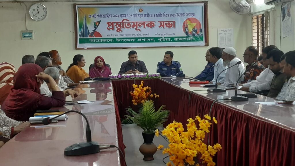 ২৫ মার্চ গণহত্যা দিবস ২০২৬ এবং ২৬ মার্চ মহান স্বাধীনতা ও জাতীয় দিবস ২০২৬ যথাযোগ্য মর্যাদায় উদযাপন উপলক্ষে রাজশাহীর পুঠিয়ায় এক প্রস্তুতিমূলক সভা অনুষ্ঠিত হয়েছে।