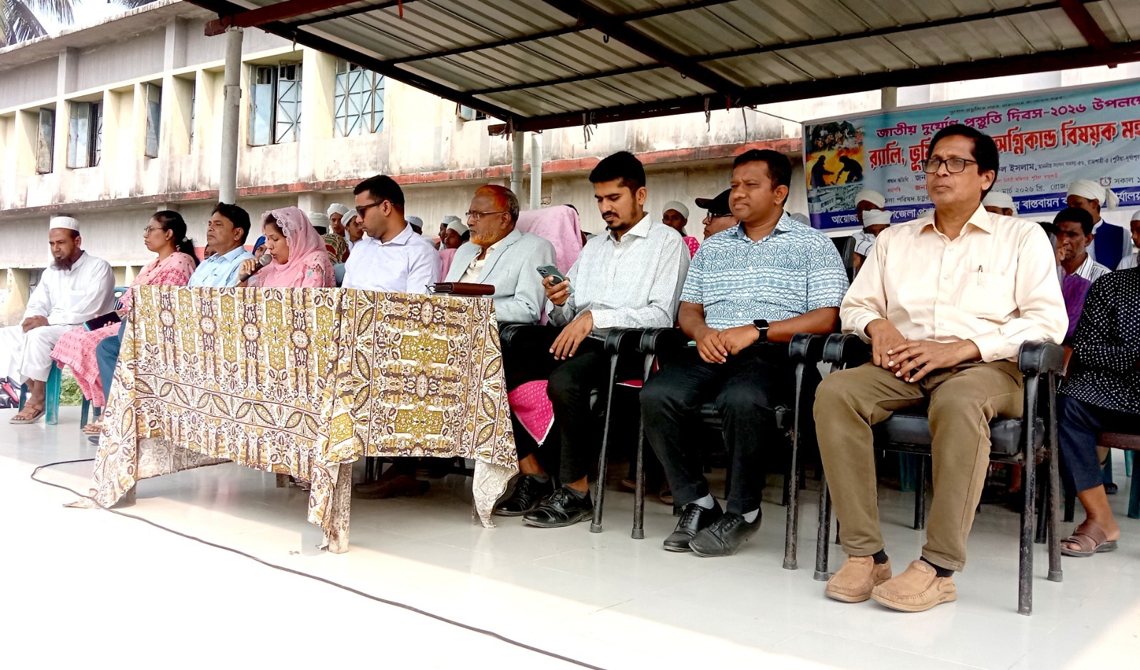 পরে সেখানে ফায়ার সার্ভিসের উদ্যোগে ভূমিকম্প ও অগ্নিকাণ্ড বিষয়ক একটি মহড়া অনুষ্ঠিত হয়। মহড়ায় শিক্ষার্থীসহ উপস্থিতদের দুর্যোগকালীন করণীয় সম্পর্কে সচেতন করা হয় এবং আগুন লাগলে কীভাবে দ্রুত ও নিরাপদে উদ্ধার কার্যক্রম পরিচালনা করতে হয়, তার বাস্তব অনুশীলন দেখানো হয়।