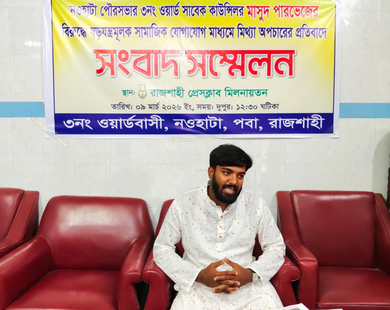 সংবাদ সম্মেলনে লিখিত বক্তব্যে মাসুদ পারভেজ সুভন বলেন, সম্প্রতি সামাজিক যোগাযোগ মাধ্যম ফেসবুকে গিয়াস উদ্দিন নামের এক ব্যক্তি তার বিরুদ্ধে একটি মিথ্যা, বিভ্রান্তিকর ও উদ্দেশ্যপ্রণোদিত পোস্ট করেছেন। ওই পোস্টে দাবি করা হয়, নওহাটা পৌরসভার ৩ নম্বর ওয়ার্ড এলাকায় রাজশাহী-৩ (পবা-মোহনপুর) আসনের সংসদ সদস্য অ্যাডভোকেট শফিকুল হক মিলনের ছবি নামিয়ে তার ছবি টাঙানো হয়েছে।