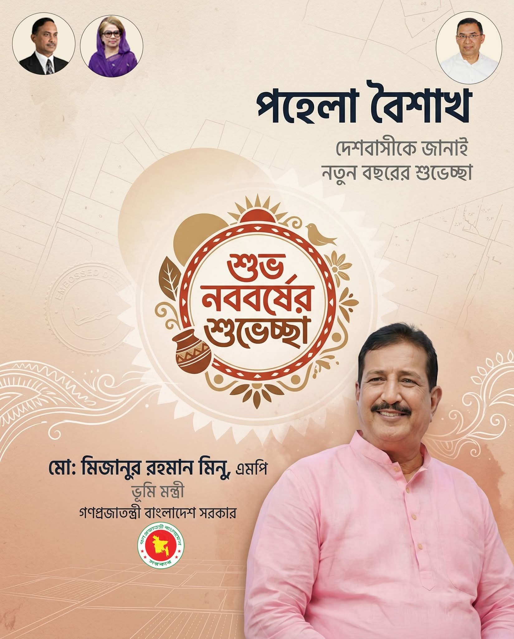 এক শুভেচ্ছা বার্তায় তিনি বলেন, বাংলা নববর্ষ বাঙালির প্রাণের উৎসব ও ঐতিহ্যের প্রতীক। নতুন বছরের আগমনে অতীতের সব গ্লানি ও দুঃখ-কষ্ট ভুলে নতুন উদ্যম ও প্রত্যাশা নিয়ে দেশকে এগিয়ে নেওয়ার আহ্বান জানান তিনি।