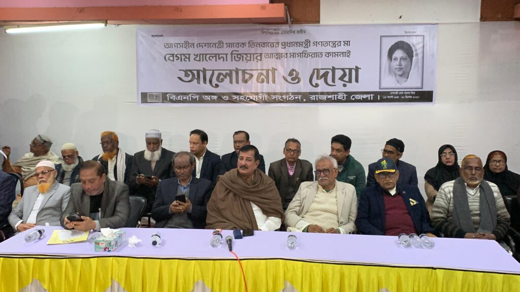 স্টাফ রিপোর্টার: তিনবারের সাবেক প্রধানমন্ত্রী দেশনেত্রী বেগম খালেদা জিয়া ছিলেন এদেশের একজন উজ্জল নক্ষত্র। আকাশে অনেক তারা জ¦লে এবং নিভে যায়, কিন্তু বেগম জিয়ার সবার মাঝে আজীবন উজ্জল নক্ষত্র হয়েই থাকবেন। বিএনপির প্রতিষ্ঠাতা চেয়ারম্যান শহীদ প্রেসিডেন্ট জিয়াউর রহমান যেমন আসলেন, জয় করলেন, আবার সবাইকে এক সাগর পানিতে ভাসিয়ে চলে গেলেন। তিনি চলে গেলেও আজীবন তিনি বিশ্ববাসীসহ দেশের মানুষের মনের মনিকোঠায় বেঁচে আছেন। তেমনি বেগম জিয়াও সেবভাইে সবার মনিকোঠায় উজ্জল নক্ষত্র হয়েই বেঁচে থাকবেন বলে বেগম জিয়ার রুহের মাগফেরাত কামনায় রাজশাহী জেলা বিএনপি অঙ্গ ও সহযোগী সংগঠনের আয়োজনে আলোচনা ও দোয়া মাহফিলে প্রধান অতিথির বক্তব্যে বিএনপি চেয়ারপার্সন বেগম খালেদা জিয়ার সাবেক উপদেষ্টা, রাসিক সাবেক মেয়র ও সংসদ সদস্য এবং রাজশাহী সদর আসনের বিএনপি মনোনীত ধানের শীষের প্রার্থী মিজানুর রহমান মিনু এই কথাগুলো বলেন।