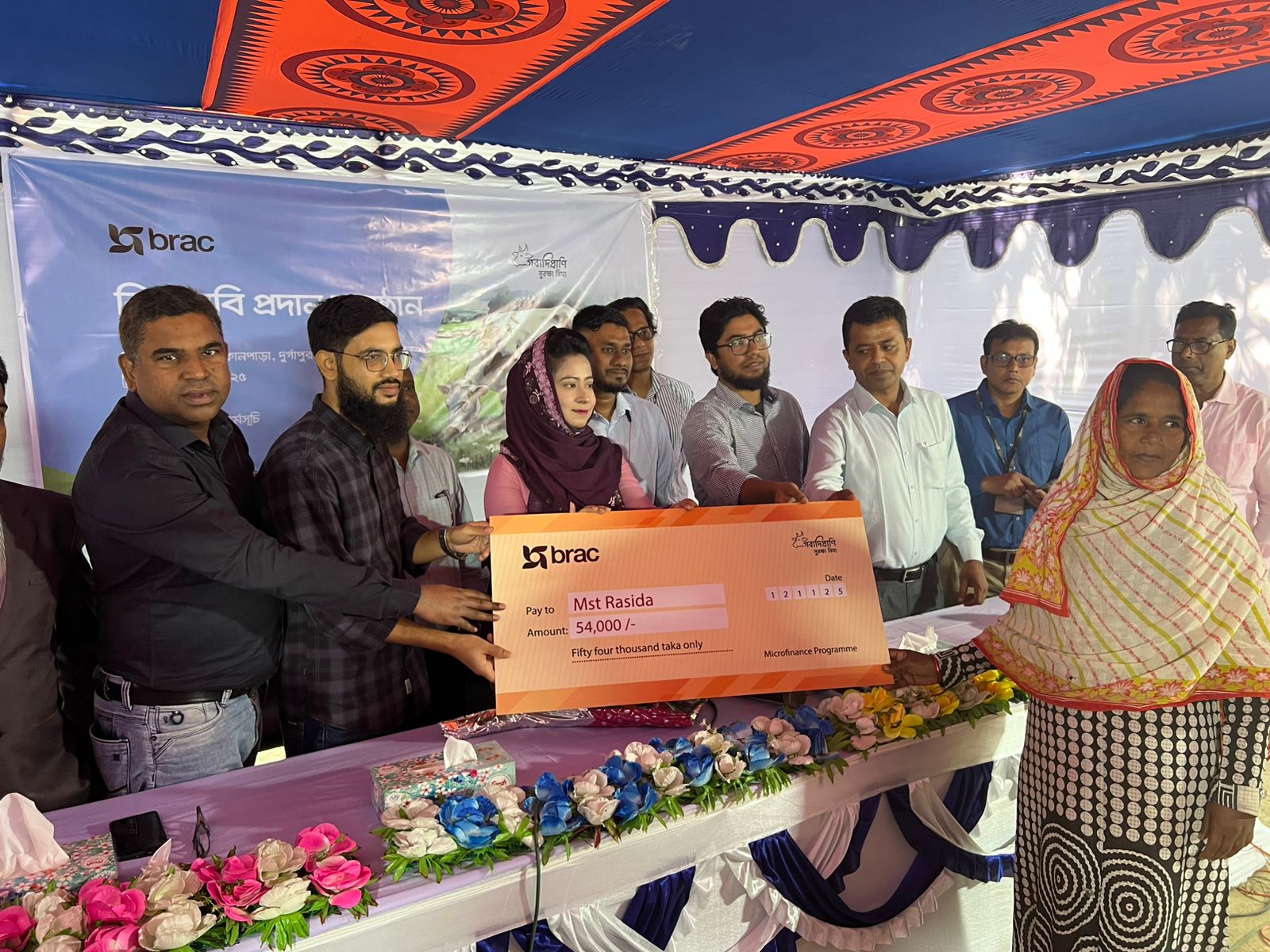 মোঃ রাকিবুল ইসলাম : গ্রামীণ খামারিদের আর্থিক নিরাপত্তা নিশ্চিত করতে ব্র্যাকের গবাদিপ্রাণি সুরক্ষা বিমা কর্মসূচি এখন এক সফল উদ্যোগে পরিণত হয়েছে। রাজশাহী বিভাগে এ পর্যন্ত পাঁচটি গরুর বিমা দাবি অনুমোদনের মধ্য দিয়ে এ কর্মসূচি খামারিদের জীবনে এনেছে নতুন আশার আলো। এরই ধারাবাহিকতায় বুধবার (১২ নভেম্বর) রাজশাহীর দুর্গাপুর উপজেলার দেলুয়াবাড়ি ইউপির হাট কানপাড়ার তেঘরিয়া গ্রামে অনুষ্ঠিত হয় এক প্রাণবন্ত বিমা দাবি হস্তান্তর অনুষ্ঠান।