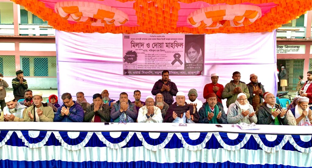 স্টাফ রিপোর্টার: সাবেক প্রধানমন্ত্রী ও বিএনপি চেয়ারপার্সন বেগম খালেদা জিয়ার বিদেহী আত্মার মাগফিরাত কামনায় মিলাদ ও দোয়া মাহফিল অনুষ্ঠিত হয়েছে। শুক্রবার বিকেলে রাজশাহীর পবা উপজেলার বড়গাছি ইউনিয়নের ভালাম উচ্চ বিদ্যালয় প্রাঙ্গণে ৮ নম্বর ওয়ার্ড বিএনপির উদ্যোগে এ দোয়া মাহফিলের আয়োজন করা হয়।