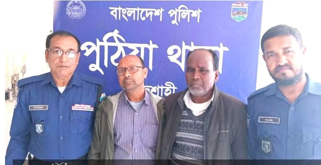 ১৮ডিসেম্বর২০২৫ইং তারিখ,রোজ (বৃহস্পতিবার), রাজশাহীর পুঠিয়া উপজেলায় হযরত আলী ও আব্দুল হান্নান নামের দুই আওয়ামী লীগ নেতাকে গ্রেফতার করেছে আইনশৃঙ্খলা বাহিনী। গ্রেফতারকৃতদের বাড়ি উপজেলার কানাই পাড়া গ্রামে বলে জানা গেছে।