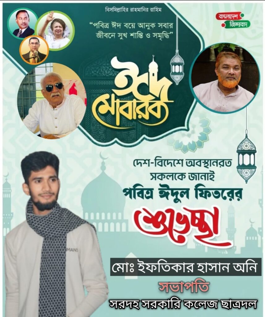 পবিত্র ঈদুল ফিতর উপলক্ষে দেশ-বিদেশে অবস্থানরত সকল শুভাকাঙ্ক্ষী ও সাধারণ মানুষকে আন্তরিক শুভেচ্ছা ও ঈদ মোবারক জানিয়েছেন সরদহ সরকারি কলেজ ছাত্রদলের সভাপতি মো: ইফতিকার হাসান অনি।