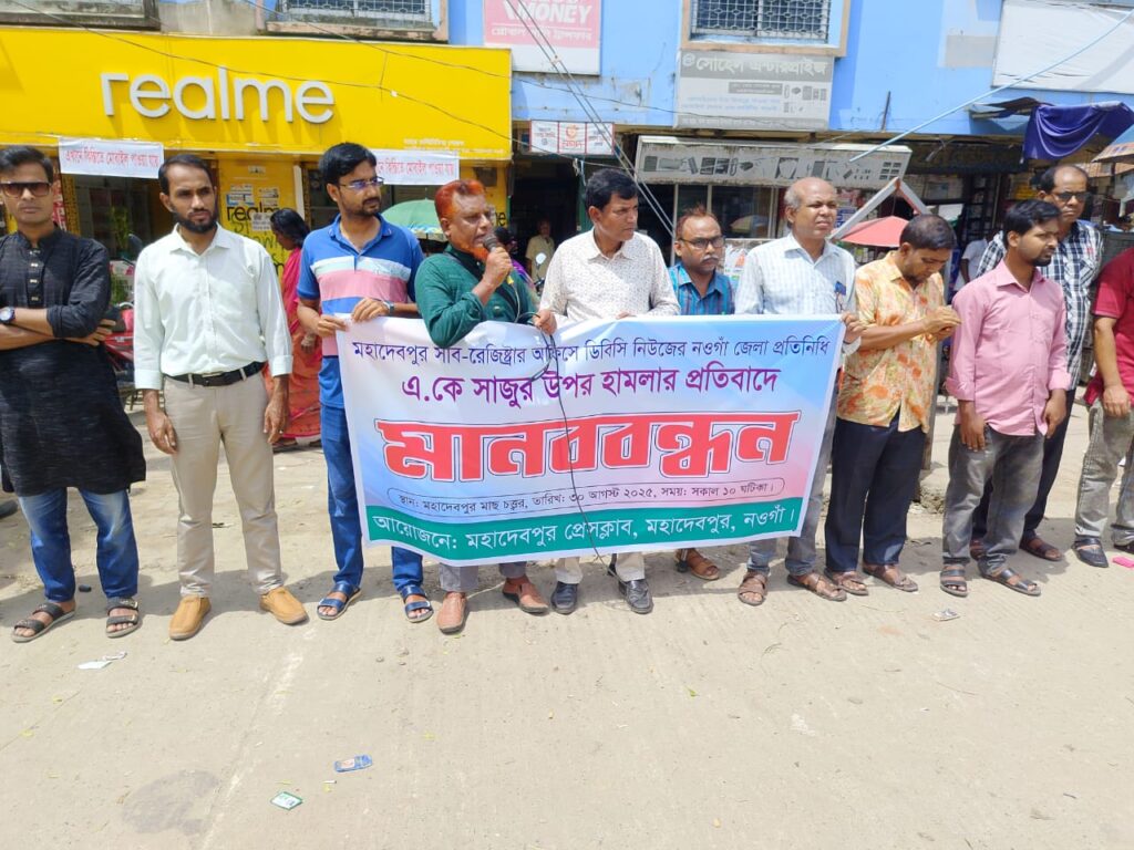 সাংবাদিকের উপর হামলার প্রতিবাদে মহাদেবপুর প্রেসক্লাবের মানববন্ধন ও প্রতিবাদ সভা