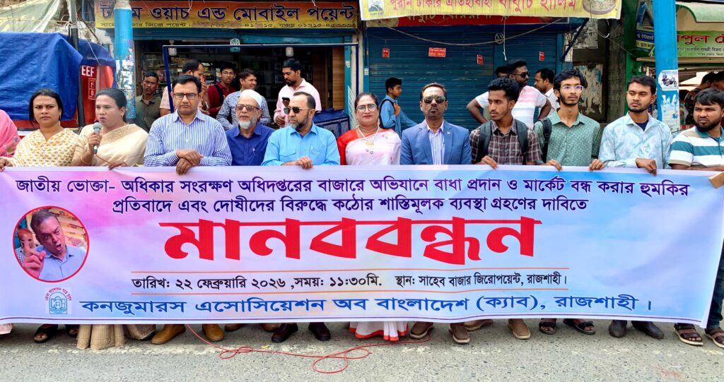 বাজার তদারকিতে বাধা ও হুমকির প্রতিবাদে রাজশাহীতে ক্যাবের মানববন্ধন